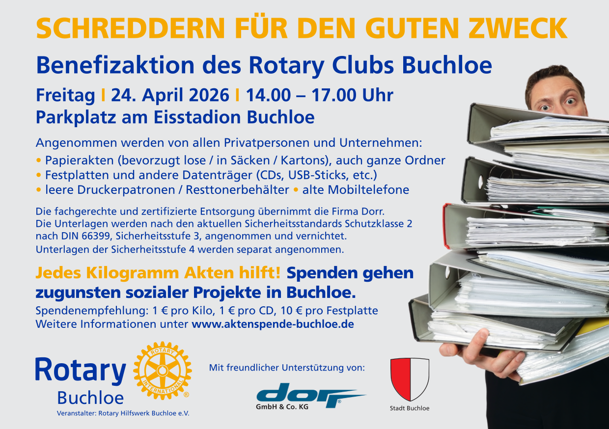 Auch in diesem Jahr können Sie Ihre sensiblen Dokumente sowie nicht mehr benötigte Datenträger sicher bei der Aktenschredder-Aktion des Rotary Clubs Buchloe für den guten Zweck loswerden.