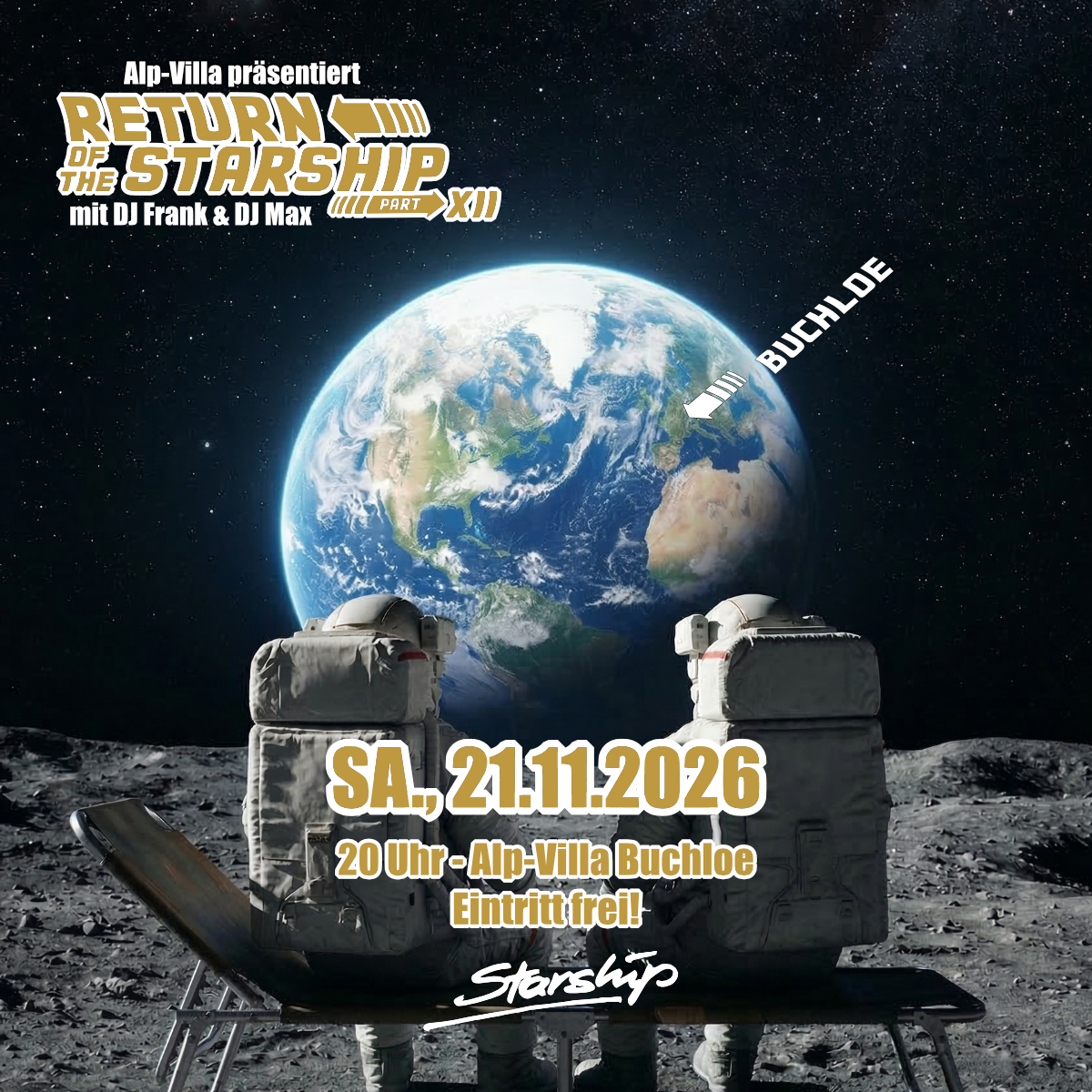 DJ Frank und DJ Max mit der original Starship-Crew und das gesamte Team der Alp-Villa freuen sich auf euch!